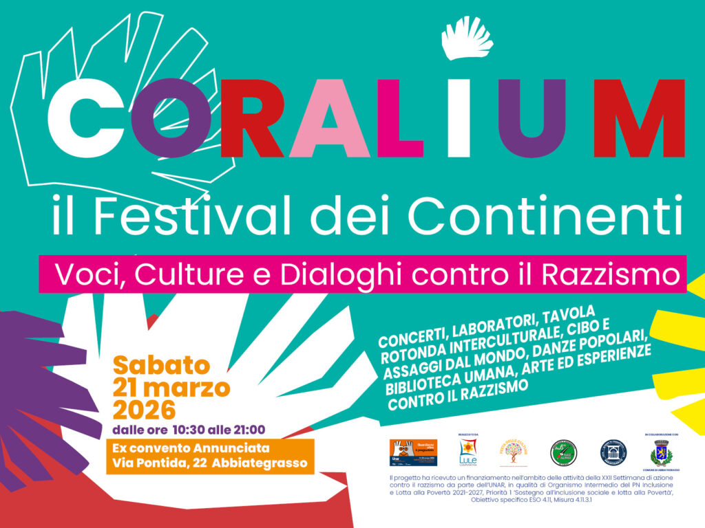 Nasce ad Abbiategrasso “Coralium – il Festival dei Continenti”, un’iniziativa promossa da Cooperativa Lule Onlus, in collaborazione con il Comune di Abbiategrasso – Consulta Interculturale (Servizi Sociali, Istruzione e Cultura), che si terrà il 21 marzo 2026 presso l’Ex Convento dell’Annunciata, nel cuore della XXII Settimana d’Azione contro il Razzismo promossa da UNAR. Il progetto ha infatti ricevuto un finanziamento nell’ambito delle attività della XXII Settimana di azione contro il razzismo da parte dell’UNAR, in qualità di Organismo Intermedio del PN Inclusione e Lotta alla Povertà 2021-2027, Priorità 1 ‘Sostegno all’inclusione sociale e lotta alla Povertà’, Obiettivo specifico ESO 4.11, Misura 4.11.3.1.